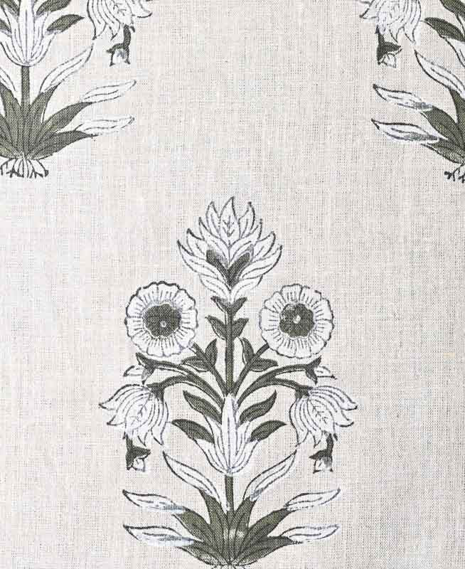 Hand-carved nature-inspired motifs unfold across this fabric in a rhythmic, repeating design. Each layer is block printed by hand using centuries-old techniques passed down through generations of artisans in India. The result is a textile rich in character—bringing softness, dimension, and a distinctly human touch to any space. Designed to layer with ease, it complements both relaxed and refined interiors.