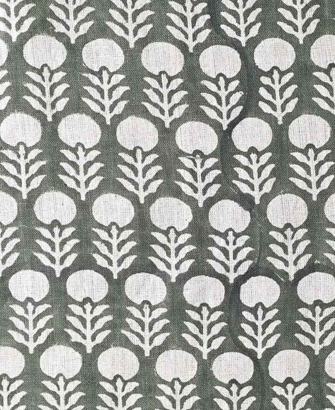 Hand-carved nature-inspired motifs unfold across this fabric in a rhythmic, repeating design. Each layer is block printed by hand using centuries-old techniques passed down through generations of artisans in India. The result is a textile rich in character—bringing softness, dimension, and a distinctly human touch to any space. Designed to layer with ease, it complements both relaxed and refined interiors.