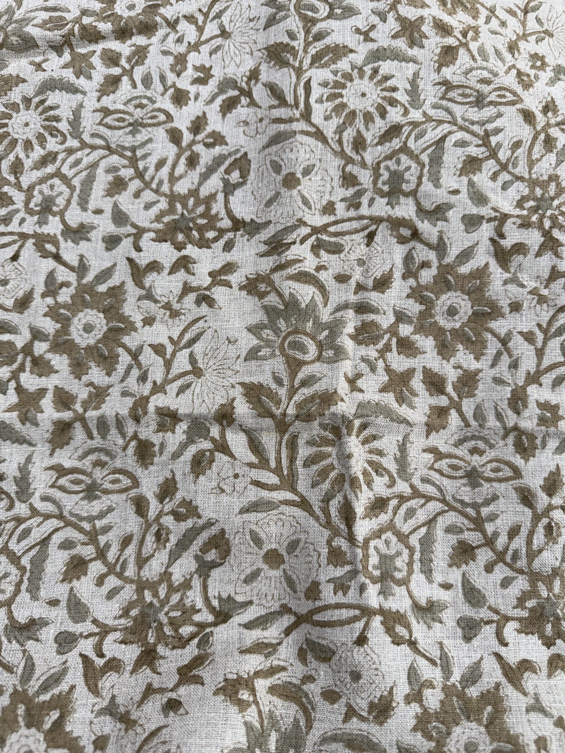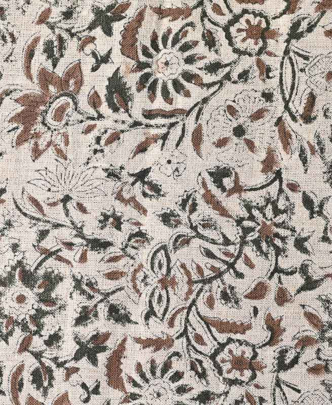 Hand-carved nature-inspired motifs unfold across this fabric in a rhythmic, repeating design. Each layer is block printed by hand using centuries-old techniques passed down through generations of artisans in India. The result is a textile rich in character—bringing softness, dimension, and a distinctly human touch to any space. Designed to layer with ease, it complements both relaxed and refined interiors.