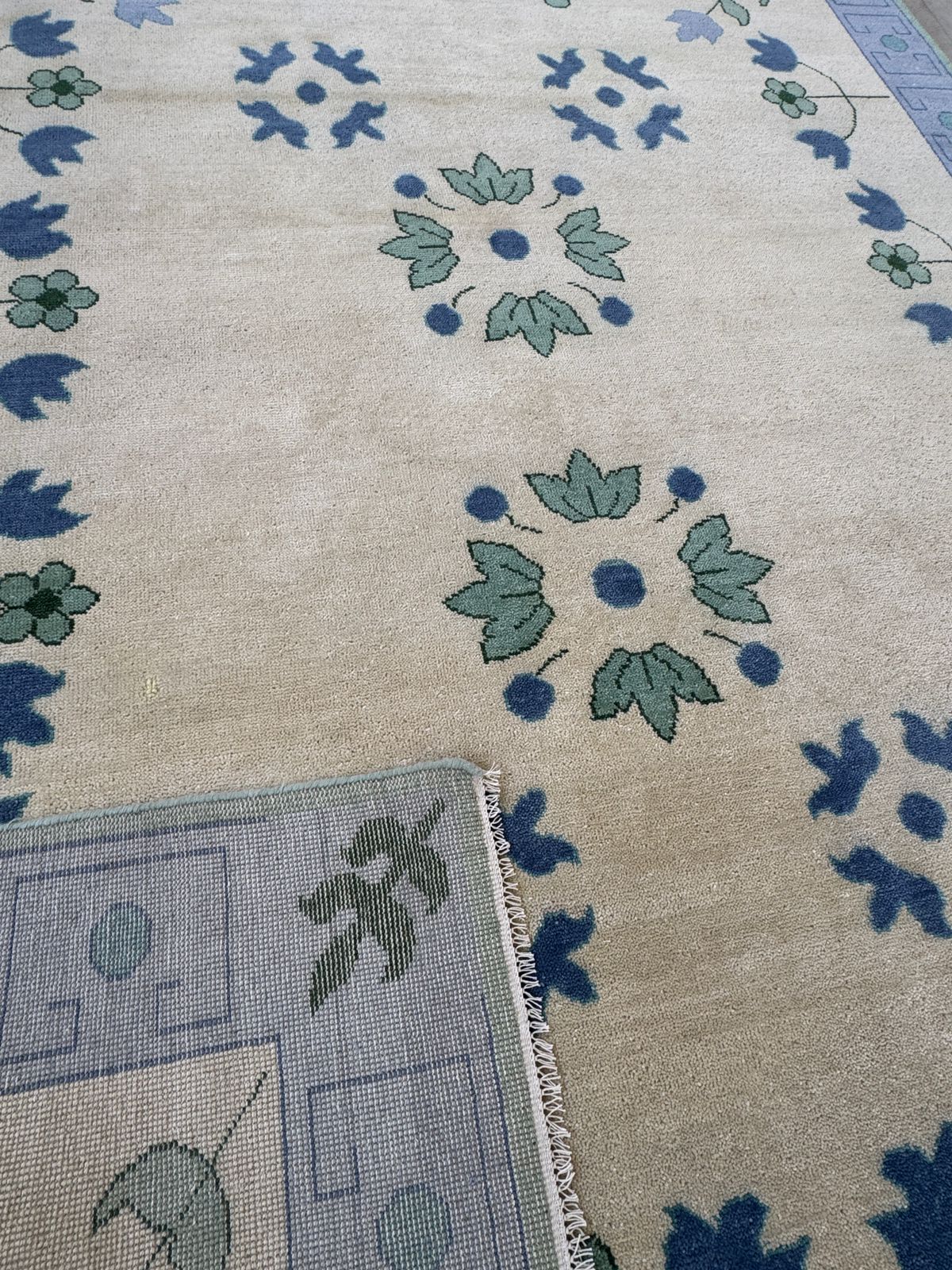 This vintage-inspired wool Oushak rug combines rustic allure with modern aesthetics for a substantial presence in any room. It is meticulously crafted by master artisans in the villages of India using natural dyes and ancient techniques. This stunning plush rug is the perfect addition to any space with its unique color palette and design. All Oushak rugs are entirely hand-knotted without the use of machinery and are custom orders.