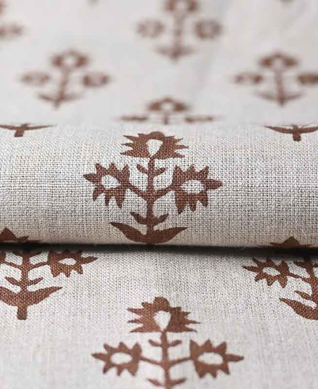 Hand-carved nature-inspired motifs unfold across this fabric in a rhythmic, repeating design. Each layer is block printed by hand using centuries-old techniques passed down through generations of artisans in India. The result is a textile rich in character—bringing softness, dimension, and a distinctly human touch to any space. Designed to layer with ease, it complements both relaxed and refined interiors.