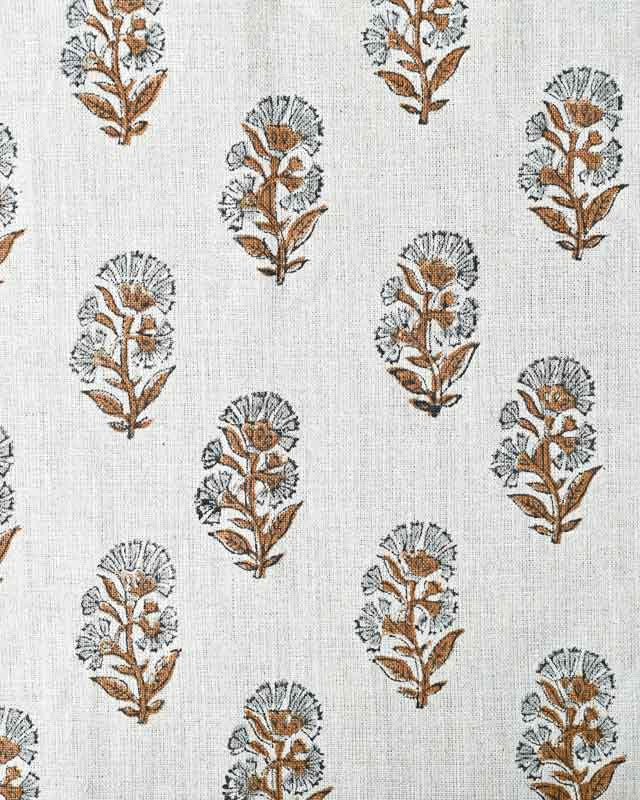 Hand-carved nature-inspired motifs unfold across this fabric in a rhythmic, repeating design. Each layer is block printed by hand using centuries-old techniques passed down through generations of artisans in India. The result is a textile rich in character—bringing softness, dimension, and a distinctly human touch to any space. Designed to layer with ease, it complements both relaxed and refined interiors.